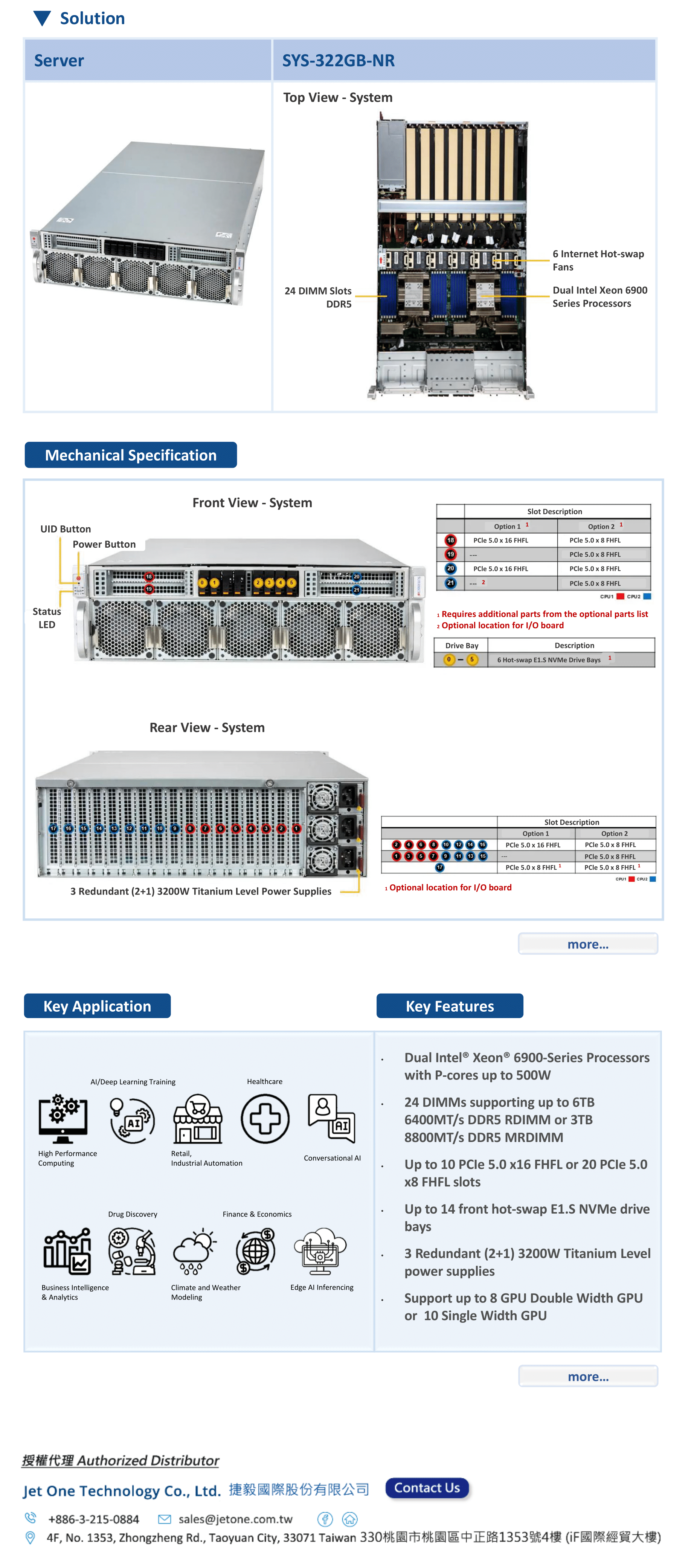 Jet One provides Supermicro New Edge AI Inferencing Systems SYS-322GB-NR, the 3U Dual Socket and 20 PCIe Slots Inferencing GPU server. The SYS-322GB-NR supports dual Intel Xeon 6900 series processors with P-cores up to 500W. Flexible PCIe slot options up to 20 PCI 5.0 x 8 slots or 10 PCIe 5.0 x 16 slots that can support 8 high power GPU and 2 high speed networking cards. An ideal solution to embrace large language models (LLM) in edge locations for daily operations, capable of running in traditional air-cooled environments. Supermicro全新Edge AI推理系統SYS-322GB-NR,是一款3U雙插槽、具備20個PCIe插槽的推理GPU伺服器。不僅支援雙Intel Xeon 6900系列處理器,更擁有高達500W的P核心性能。AI解決方案應用在邊緣地點支持大型語言模型(LLM)的日常運營,並能夠在傳統風冷環境中運行。